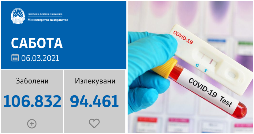 Вкупната бројка на КОВИД-дијагностицирани лица во нашата земја од почетокот на епидемијата изнесува 106.832, бројката на оздравени пациенти е 94.461, на починати е 3.185, а бројот на активни случаи изнесува 9.186.