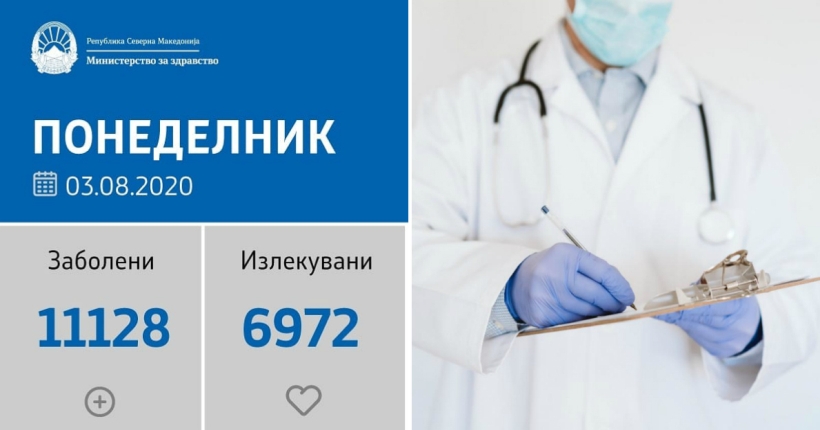Вкупната бројка на дијагностицирани со КОВИД-19 во нашата земја од почетокот на епидемијата изнесува 11.128, бројката на оздравени пациенти е 6.972, на починати е 500, а во моментов бројот на активни случаи во земјата изнесува 3.656.