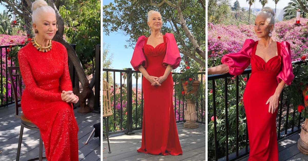Припиениот светкав фустан, кој Мирен го искомбинира со златен накит, е со потпис на Мајкл Корс.