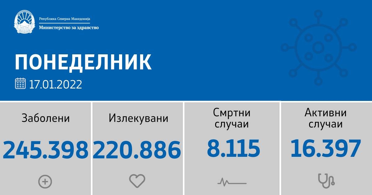 Вкупната бројка на КОВИД-дијагностицирани лица во нашата земја од почетокот на епидемијата изнесува 245.398, бројот на оздравени пациенти е 220.886, на починати е 8.115, а бројот на активни случаи изнесува 16.397.