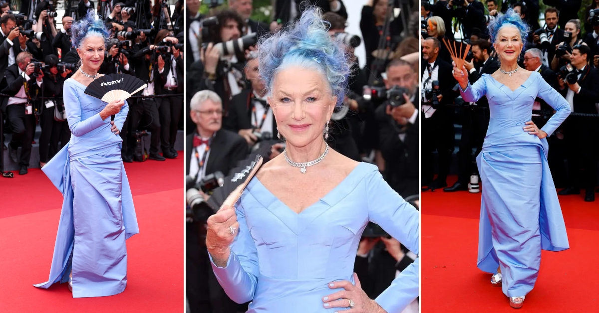 77-годишната филмска легенда зачекори на црвениот тепих во Кан со сина коса која совршено одговараше на нејзината сина тоалета. Фустанот од Del Core, таа го надополни со сребрени сандали од Sole Bliss.