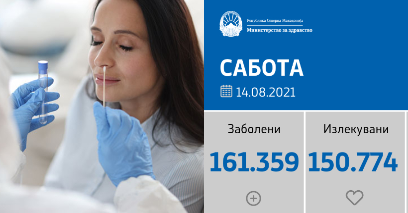 Вкупната бројка на КОВИД-дијагностицирани лица во нашата земја од почетокот на епидемијата изнесува 161.359 бројката на оздравени пациенти е 150.774, на починати е 5.542, а бројот на активни случаи изнесува 5.043.