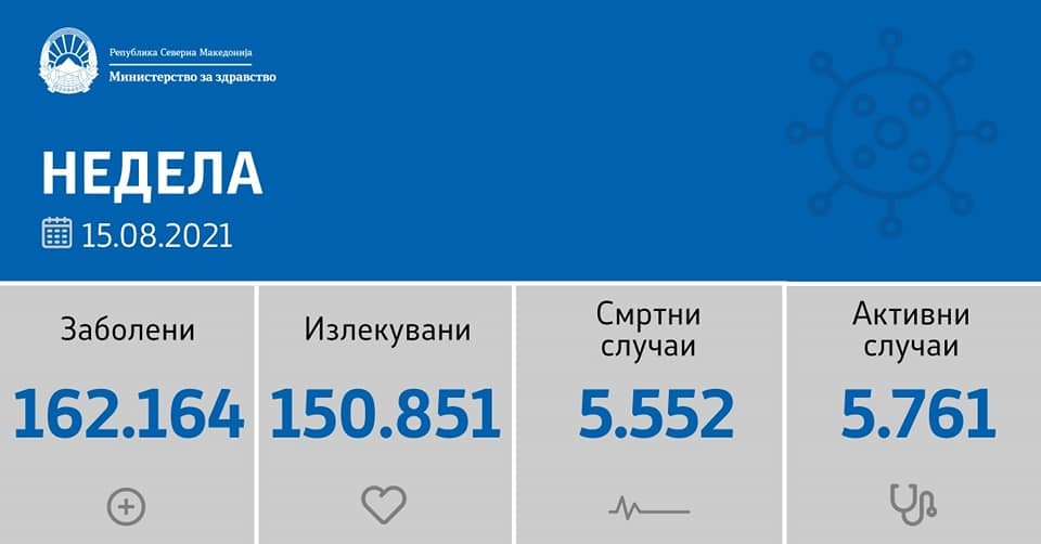 Вкупната бројка на КОВИД-дијагностицирани лица во нашата земја од почетокот на епидемијата изнесува 162.164 бројката на оздравени пациенти е 150.851, на починати е 5.552, а бројот на активни случаи изнесува 5.761.