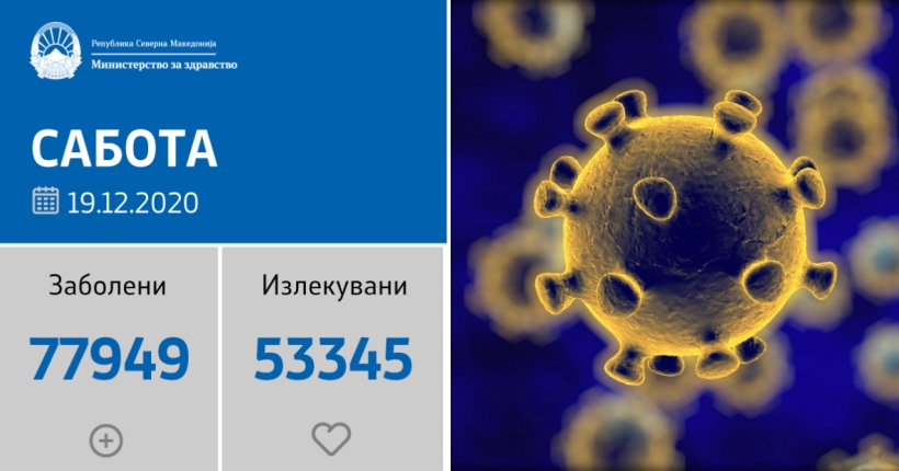Вкупната бројка на ковид дијагностицирани во нашата земја од почетокот на епидемијата изнесува 77.949, бројката на оздравени пациенти е 53.345, на починати е 2.274, а бројот на активни случаи изнесува 22.330.