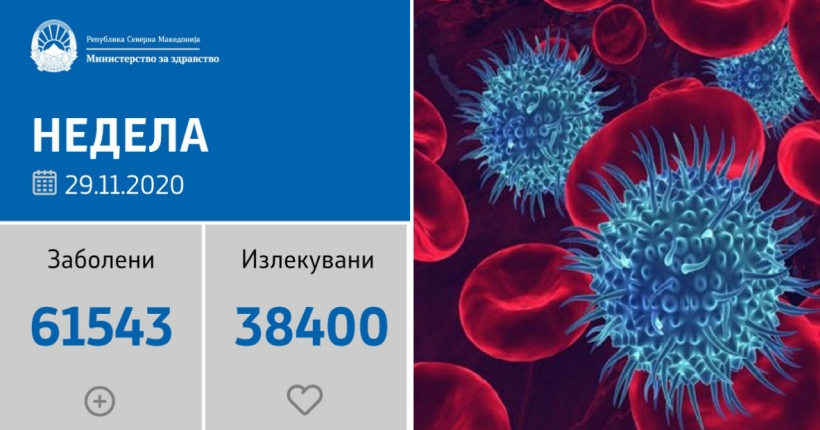 Вкупната бројка на ковид дијагностицирани во нашата земја од почетокот на епидемијата изнесува 61.543, бројката на оздравени пациенти е 38.400 на починати е 1.731, а бројот на активни случаи изнесува 21.412.