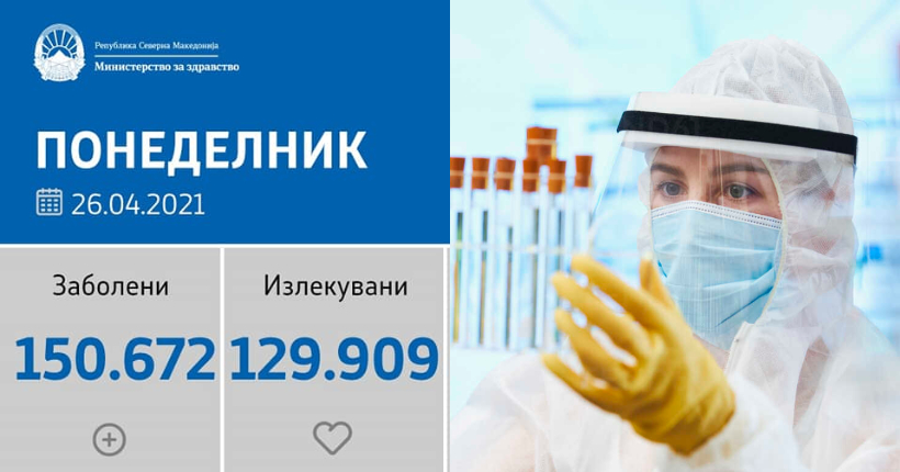 Вкупната бројка на Ковид-дијагностицирани лица во нашата земја од почетокот на епидемијата изнесува 150.672, бројката на оздравени пациенти е 129.909, на починати е 4.714, а бројот на активни случаи изнесува 16.049.