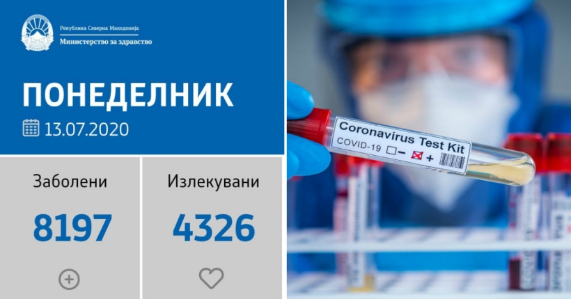 Вкупната бројка на дијагностицирани со КОВИД-19 во нашата земја од почетокот на епидемијата изнесува 8.197, бројката на оздравени пациенти е 4.326, на починати е 385, а во моментов бројот на активни случаи во земјата изнесува 3.486.
