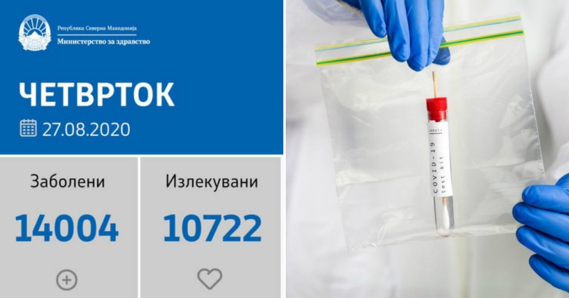 Вкупната бројка на ковид дијагностицирани во нашата земја од почетокот на епидемијата изнесува 14.004, бројката на оздравени пациенти е 10.722, на починати е 585, а во моментов бројот на активни случаи во земјата изнесува 2.697.