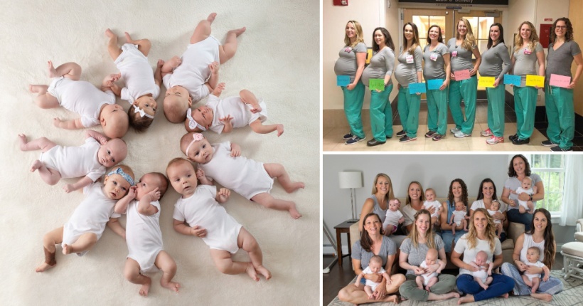 Девет медицински сестри кои работат заедно и беа истовремено бремени, се породија и снимија слатка фотосесија со своите бебенца.