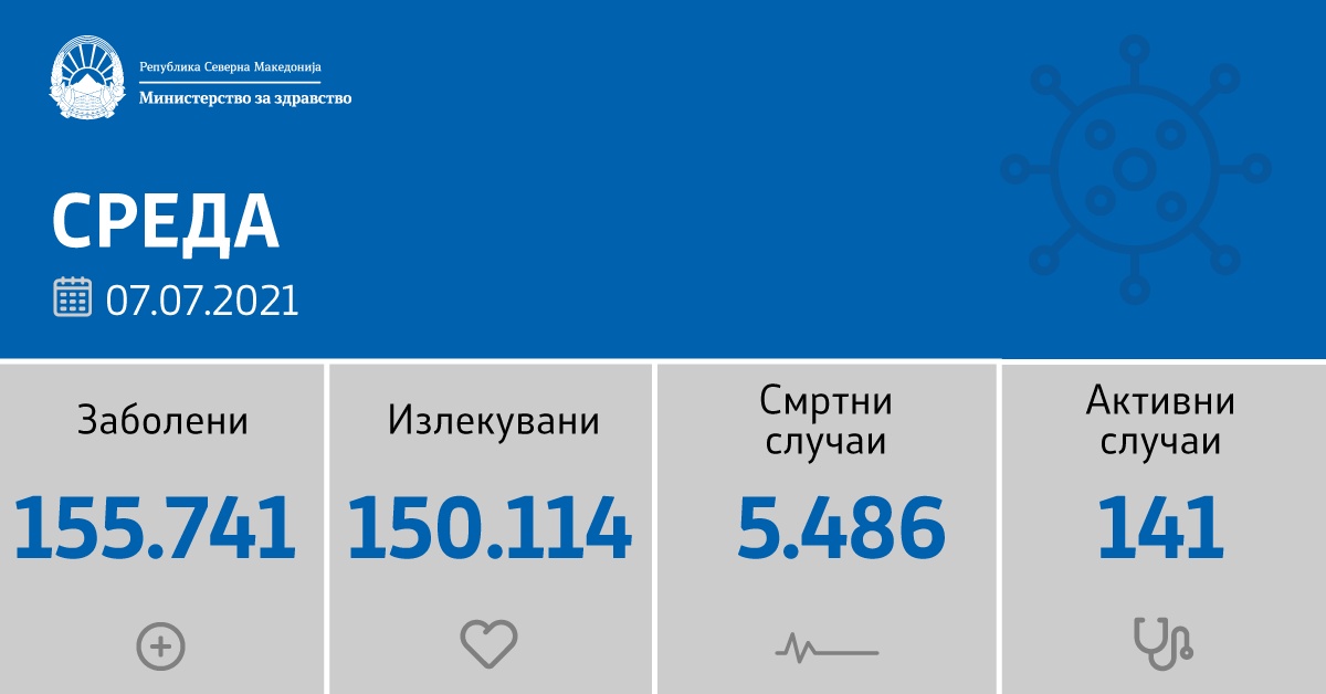 Вкупната бројка на КОВИД-дијагностицирани лица во нашата земја од почетокот на епидемијата изнесува 155.741, бројката на оздравени пациенти е 150.114, на починати е 5.486, а бројот на активни случаи изнесува 141.
