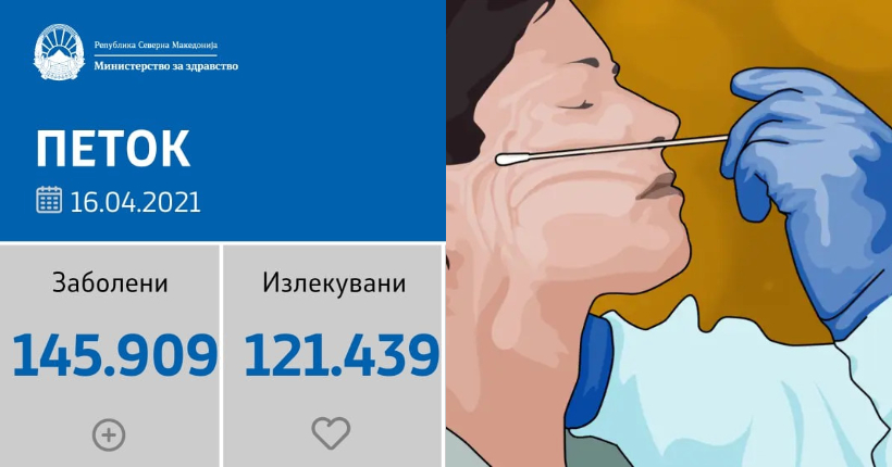 Вкупната бројка на КОВИД-дијагностицирани лица во нашата земја од почетокот на епидемијата изнесува 145.909, бројката на оздравени пациенти е 121.439, на починати е 4.388, а бројот на активни случаи изнесува 20.082.
