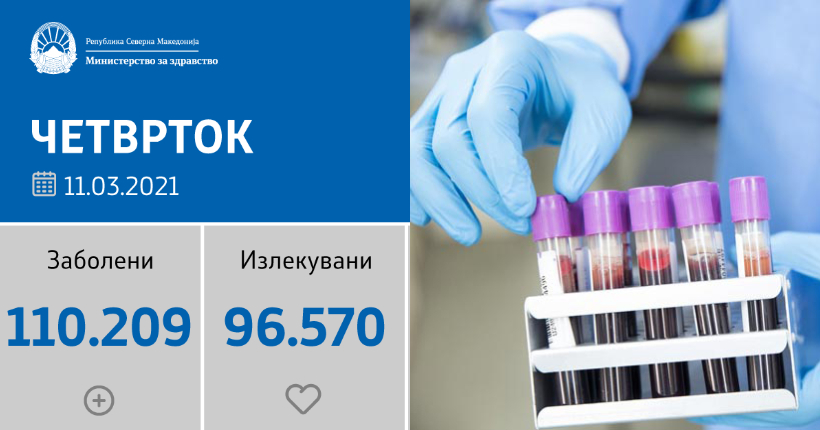 Вкупната бројка на КОВИД-дијагностицирани лица во нашата земја од почетокот на епидемијата изнесува 110.209, бројката на оздравени пациенти е 96.570, на починати е 3.265, а бројот на активни случаи изнесува 10.374.