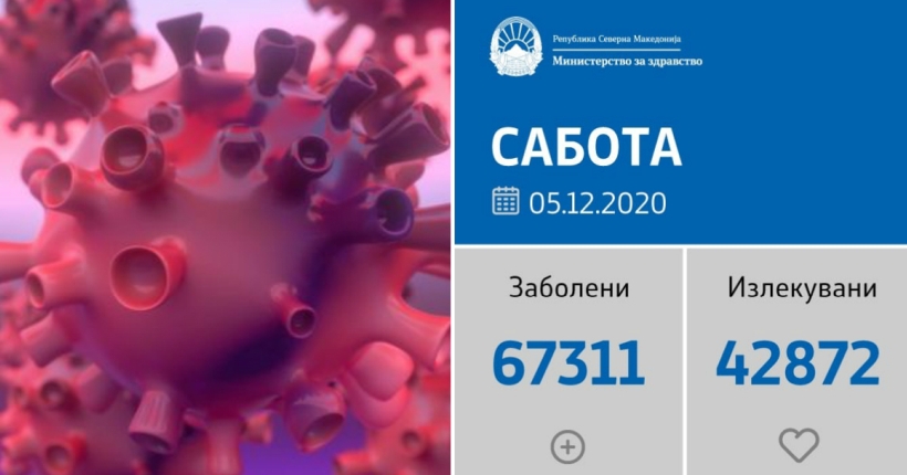 Вкупната бројка на ковид дијагностицирани во нашата земја од почетокот на епидемијата изнесува 67.311, бројката на оздравени пациенти е 42.872, на починати е 1.901, а бројот на активни случаи изнесува 22.538.