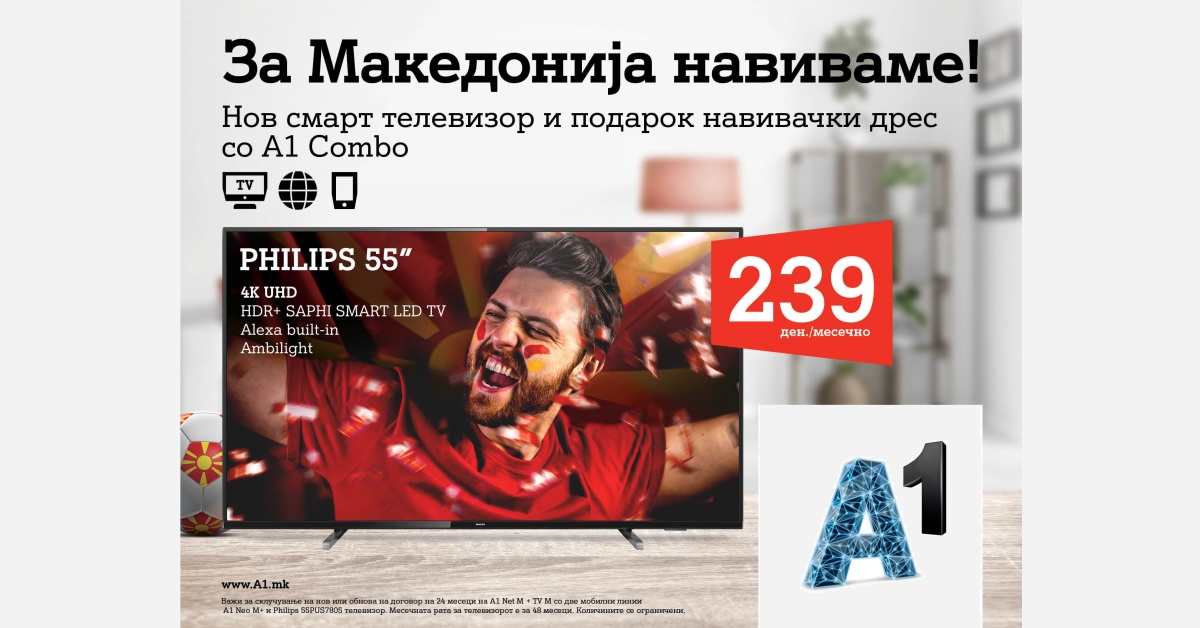 Од денеска, во портфолиото на А1 Македонија, како дел од понудата во А1 Combo М и L,достапна е најновата промоција со која постоечките и нови корисници покрај супербрз и стабилен интернет, ТВ со најквалитена слика на пазарот, Арена Спорт ТВ канали добиваат и зголемен попуст за атрактивниот Philips 55 инчен телевизор или било кој друг уред по нивен избор.Со активирање на A1 Combo M пакетот со две мобилни линиии или A1 Neo M+ корисниците добиваат 18.000 денари попуст за било кој уред. Дополнително, сите нови корисници на А1 Combo М или L пакетите добиваат и подарок – специјално дизајниран навивачки дрес со кој заедно ќе навиваме за тимот на македонската фудбалска репрезентација.