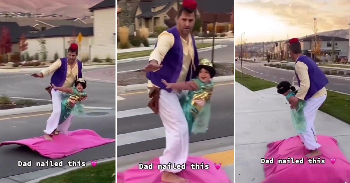 Со помош на електричен скејтборд тој направи магичен килим како од „Аладин“ и ја возеше ќерката која беше маскирана како Џасмин. Во видеото објавено од неговата сопруга Триша, таткото е на магично патување низ соседството преправен како Аладин.