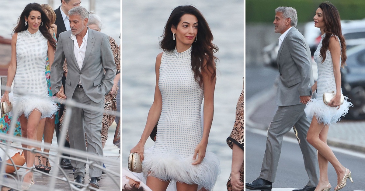61-годишниот актер и 44-годишната адвокатка беа скоцкани од глава до пети. Амал изгледаше гламурозно во кратко фустанче со пердуви, додека Џорџ носеше елегантен син костум.