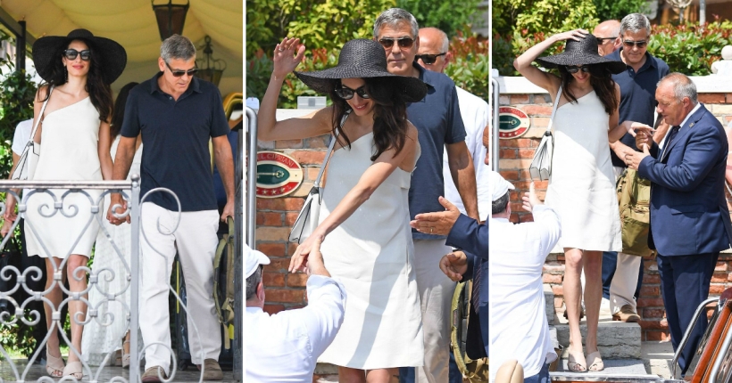41-годишната адвокатка беше облечена во бел фустан и носеше црн шешир додека со 58-годишниот актер се упатуваше кон водно такси.