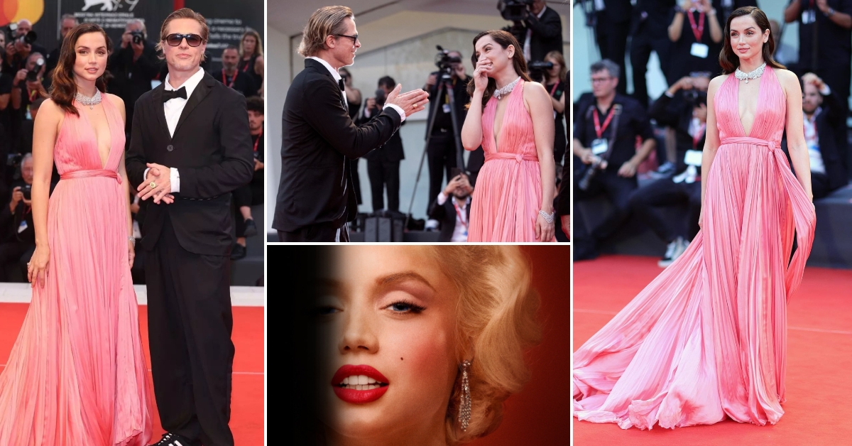 34-годишната актерка, која во филмот на Ендрју Доминик влезе во улогата на русокосата Мерилин Монро, изгледаше сензационално во розова креација од Луј Витон.