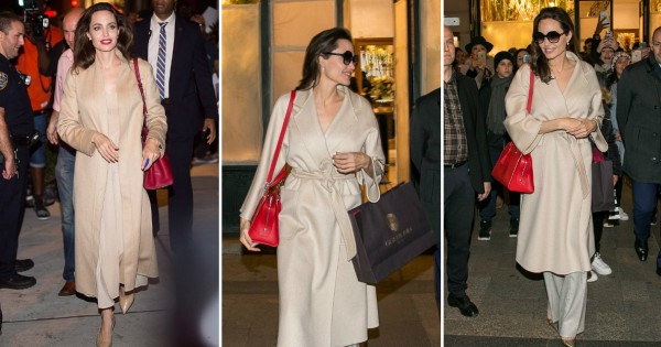 Џоли, која е заштитно лице на Guerlain, носеше елегантна комбинација во неутрални нијанси. Бежовото палто доаѓа од брендот Макс Мара.