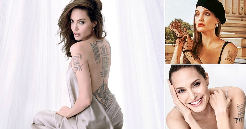 Во фокусот на една од фотографиите се големите тетоважи на грбот на Џоли. На горниот дел, таа си има истетовирано будистички благослов за мир, љубов и просперитетен живот, додека во долниот дел – голем тигар. Тетоважите на левата рака ги опишуваат координатите на местата на раѓање на нејзините деца и на нејзиниот поранешен сопруг Бред Пит.