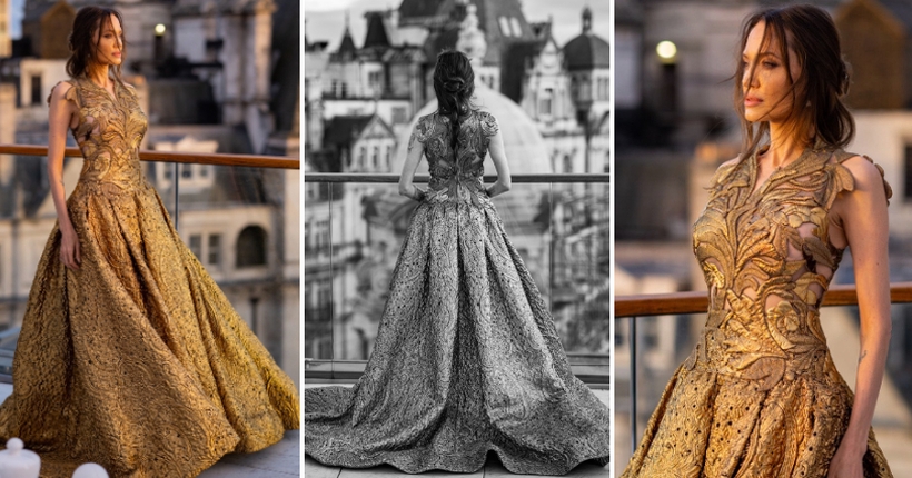 Грациозната актерка позираше на кров во Лондон во златен фустан со потпис на Валентино и изгледаше како вистинска божица. Креацијата е дел од колекцијата висока мода на брендот за сезоната есен/зима 2018 година.