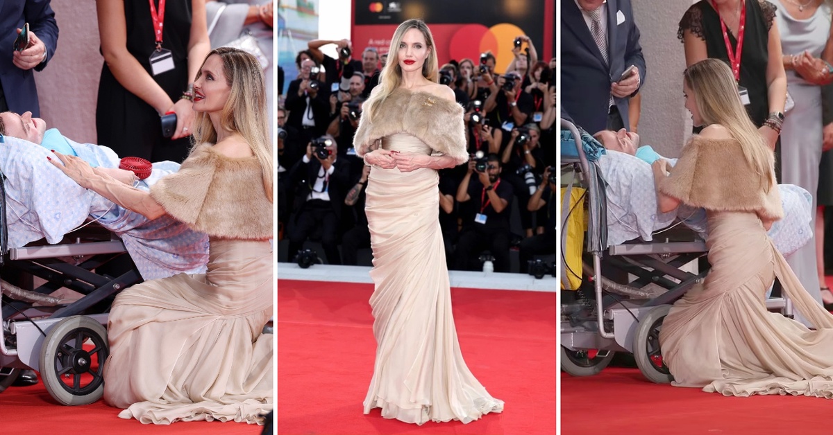 Angelina Jolie kneeling down at red carpet of Venice Film Festival to meet a fan with ALS.