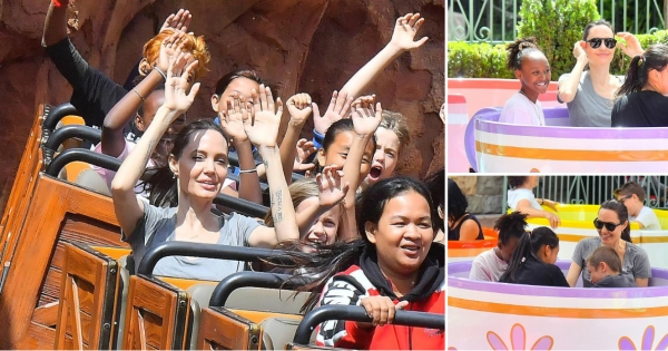 Холивудската ѕвезда беше фотографирана во забавниот парк заедно со Шајло, Захара и близнаците Вивиен и Нокс. Со нив беа и нивни пријатели од Камбоџа.