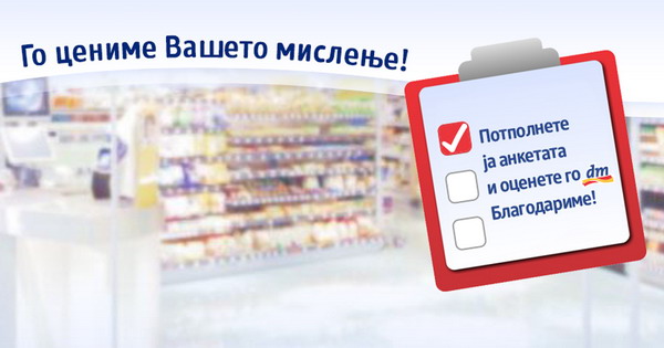 Сè што е потребно е да одвоите неколку минути и да одговорите на нашите прашања, а ние ќе се потрудиме секоја Ваша наредна посета на dm дрогериите да биде посебна!