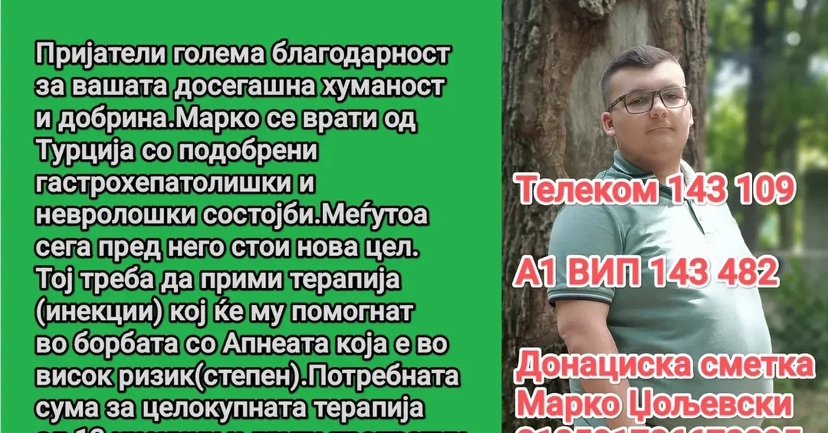 Семејството на Марко апелира до сите добри луѓе кои се во можност да помогнат со донации, за да се обезбедат средствата потребни за неговото лекување.