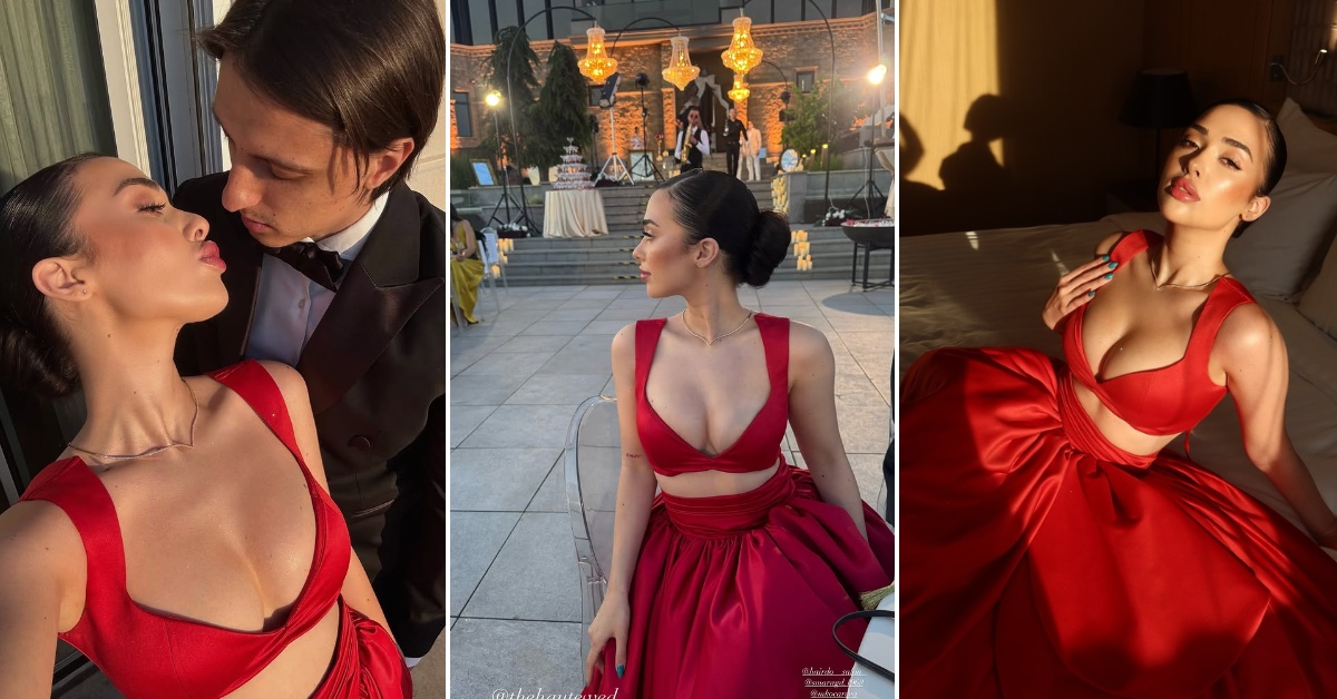 Во „Шато Камник“ во Скопје, 21-годишната пејачка изгледаше атрактивно во дводелна црвена креација со која го истакна својот сексапил.