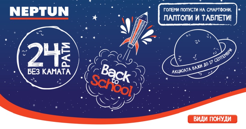 „BACK TO SCHOOL“ акција во „Нептун"! До 17-ти септември големи попусти на смартфони, лаптопи, таблетии до 24 рати без камата со haPPy кредит, кредитни картички и синдикална продажба.