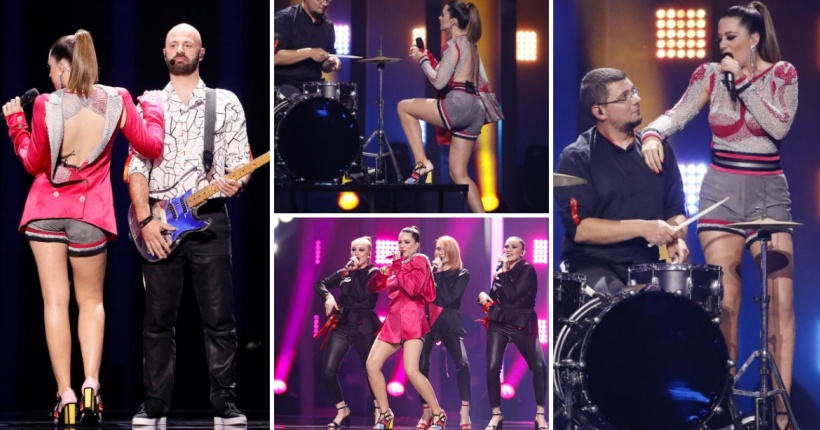 Македонската пејачка беше облечена во креација во циклама нијанса која наликуваше на сако закопчано наопаку. Потоа таа ја соблече за да ја открие блузата со богата текстура.