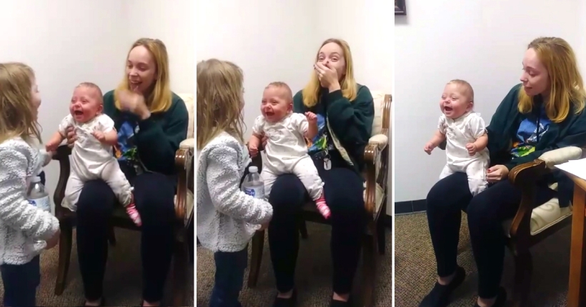 Бебенце со проблеми со слухот се смее наглас кога ќе го слушне гласот на сестричката со помош на помагало
