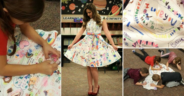 Хејли Курфман го има најубавиот подарок кој може да го добие една учителка од своите ученици. Таа побарала од дечињата да нацртаат по нешто што ги усреќува на нејзин бел фустан, а резултатот е колоритна креација со уникатна шара.