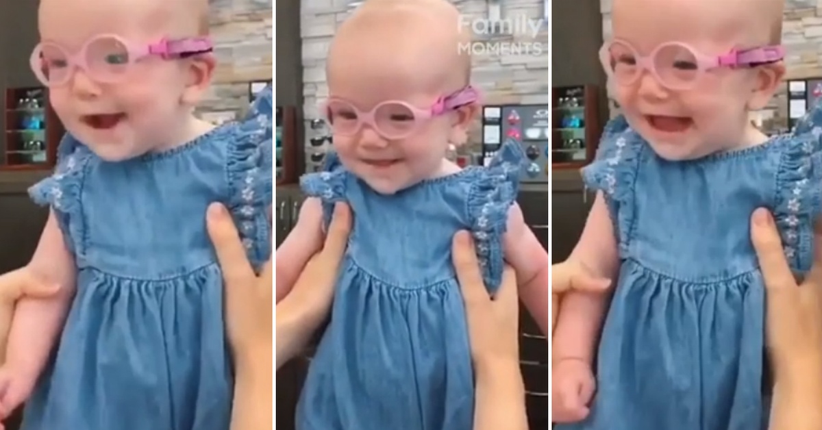Baby girl wears glasses and sees mom for the first timeThis baby girl who was struggling with undiagnosed vision problems for a long time was shocked when her parents placed a pair of glasses over her eyes for the first time.