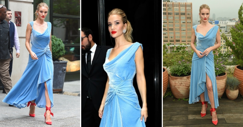 31-годишниот модел изгледаше феноменално на модниот настан во Њујорк. Синиот фустан, кој таа го искомбинира со црвени обувки, доаѓа од брендот Monse.
