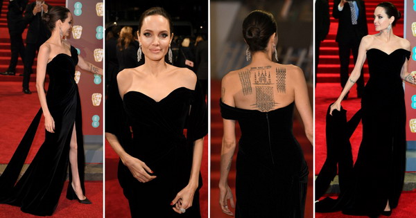 Имено, на црвениот тепих пред доделувањето на наградите на Британската академија за филмски и телевизиски уметности, речиси сите гостинки (со мали исклучоци) носеа црна облека, па и Џоли го испочитува неофицијалниот дрес-код.