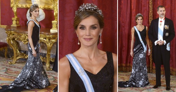 За банкетот во кралската палата во Мадрид, 45-годишната кралица носеше отмена комбинација и блескавата тијара „Mellerio Floral“.