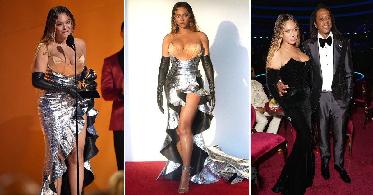 41-годишната дива го пропушти црвениот тепих и врачувањето на првата награда поради сообраќајниот метеж во Лос Анџелес. Таа пристигна на манифестацијата облечена во златно-сребрена металик креација од Гучи заедно со сопругот Џеј Зи.
