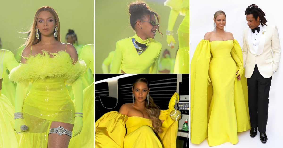 На црвениот тепих на Оскарите, Бијонсе зачекори рака за рака со сопругот Џеј Зи. Нејзин стилски избор беше жолта креација од Валентино и чантичка во форма на тениско топче.