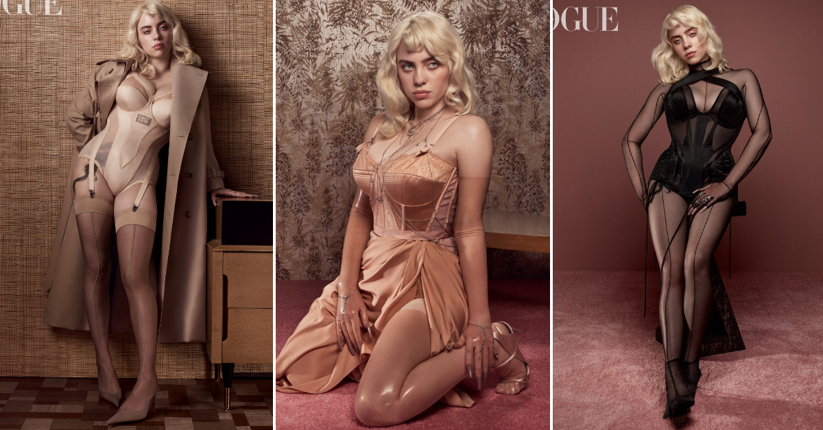 За британското модно списание, 19-годишната пејачка покажа сосема невообичаен изглед со руса коса. Младата музичарка, која сме навикнати да ја гледаме во широка облека, го разголи своето тело во провокативни корсети од Burberry, Mugler, Valentino и Alexander McQueen, откривајќи ја својата тетоважа.