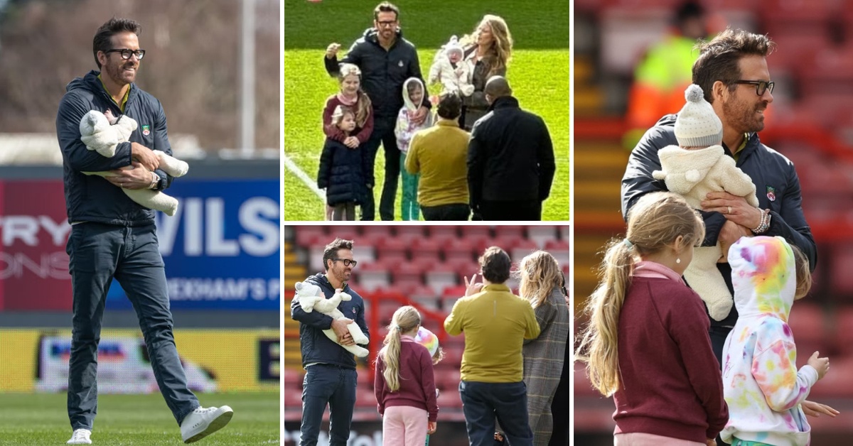 35-годишната актерка и 46-годишниот актер позираа со сите четири деца на стадион, откако Рајан го купи фудбалскиот клуб Врексам.