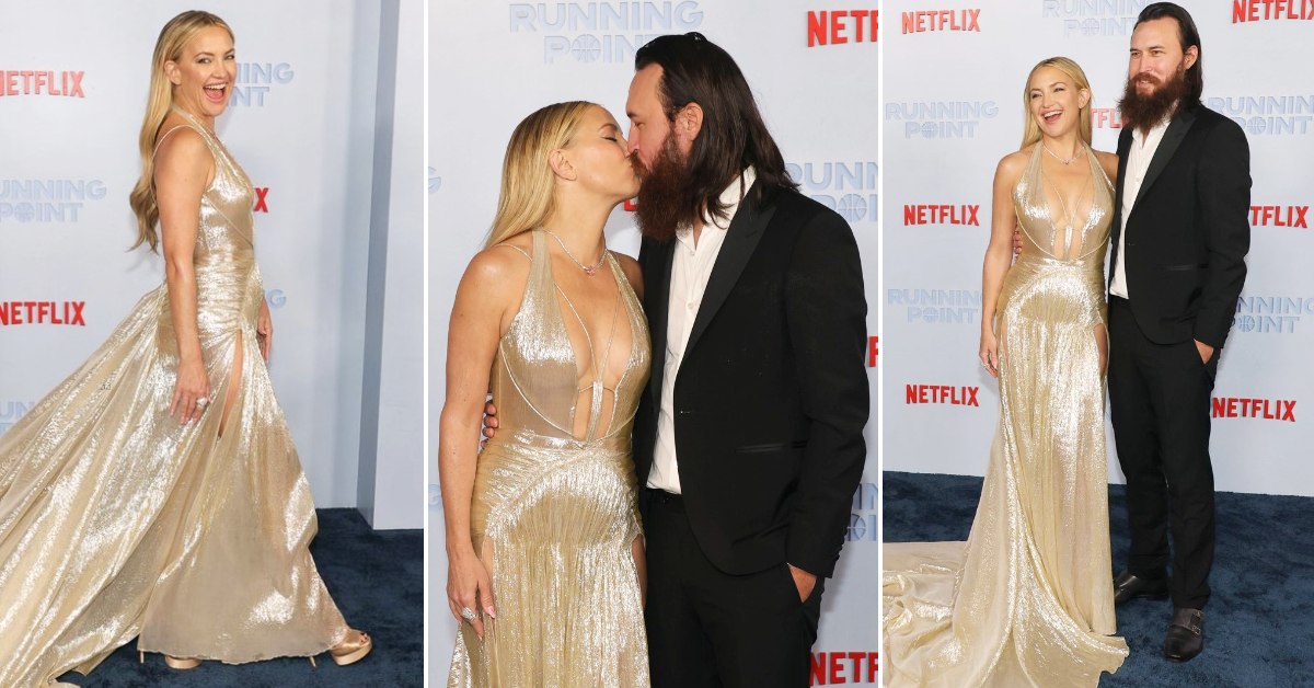 Блеска: Кејт Хадсон во атрактивна креација од Роберто Кавали се бакнуваше со вереникот на премиера