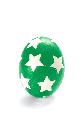 Исечете мали ѕвездички, крукчиња или други фигури од самолеплива хартија или купете готови оформени налепници. Залепете ги врз претходно сварено јајце и потопете гo во боја.