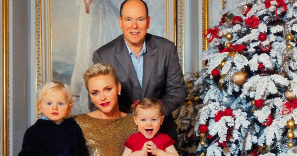 На неа, кралскиот пар од Монако позира заедно со двегодишните близнаци Жак и Габриела покрај новогодишна елка. Во позадина, се гледа портрет од незаборавната Грејс Кели, мајката на принцот Алберт.