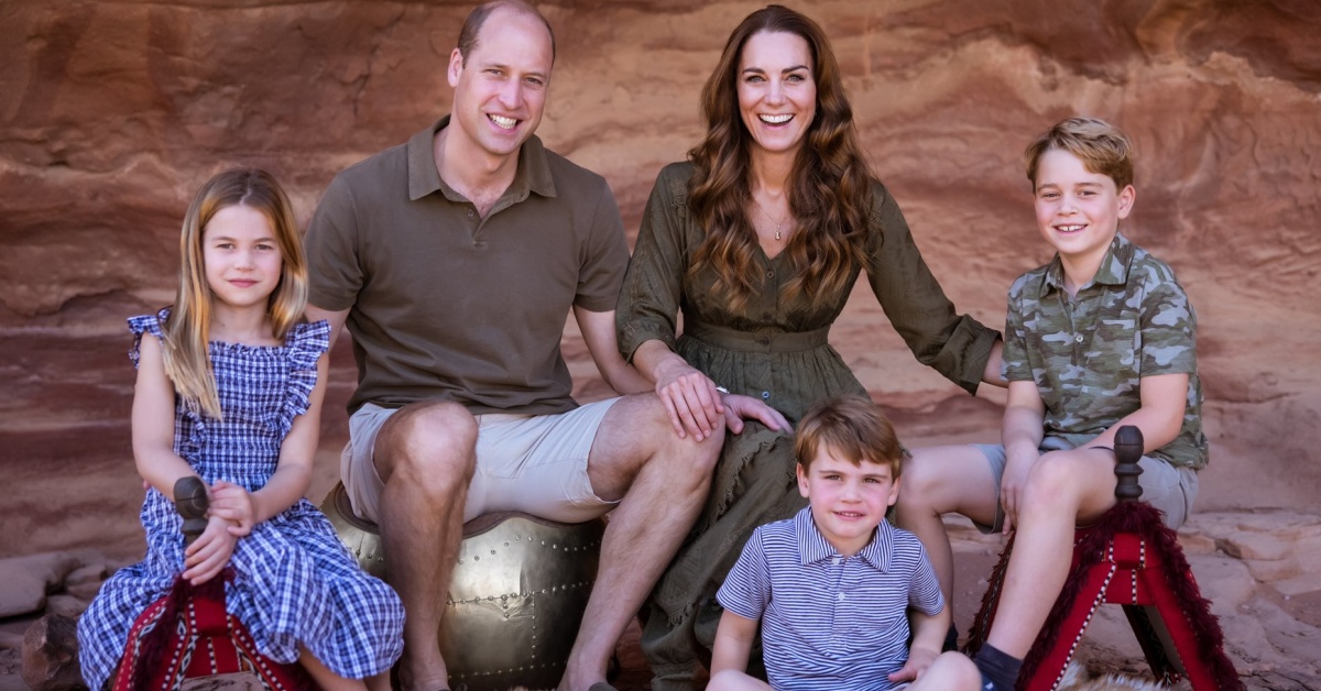 На неа, 39-годишната војвотка и 39-годишниот принц позираат со нивните трите деца - принцезата Шарлот и принцовите Џорџ и Луи.