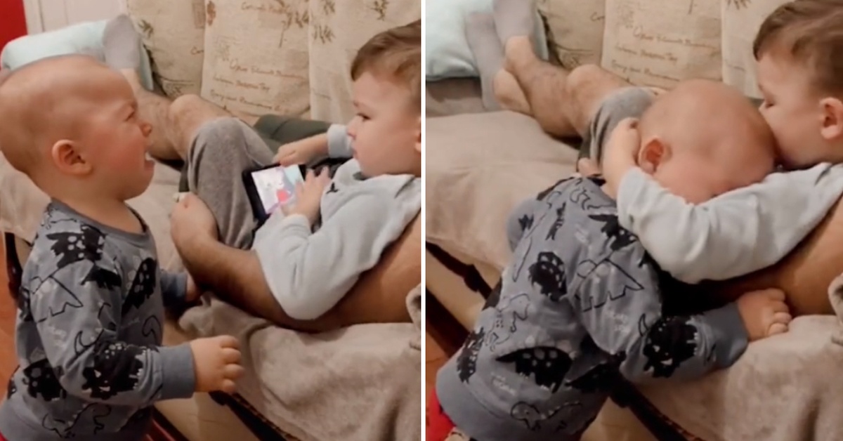 Поголемото детенце не сакајќи ќе го удри малото братче по лицето, а откако тоа ќе започне да плаче, веднаш ќе го смири само со едно гушкање.