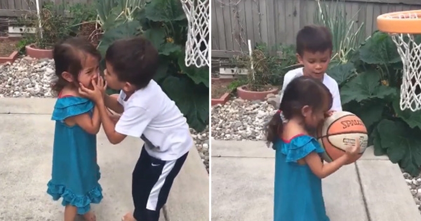 Слатко видео во кое мало момче ѝ помага на сестричката да погоди со топката во кошот топи срца.