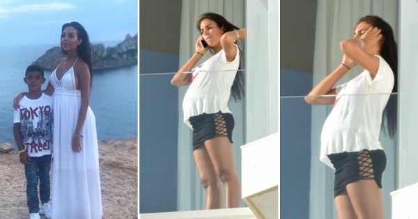23-годишната бринета беше фотографирана со пораснатото трудничко стомаче додека зборуваше на телефон на терасата од хотелската соба на шпанскиот остров.