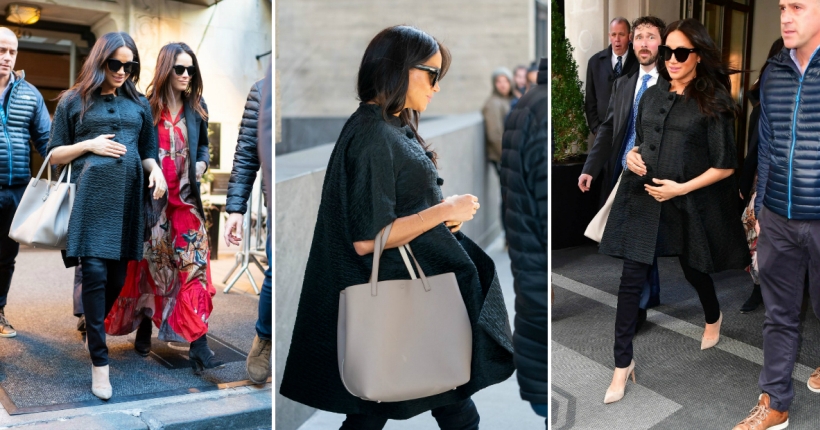 Маркл, која е во седмиот месец од бременоста и се претпоставува дека ќе се породи во април, носеше црно палто, темни фармерки и бежови салонки.